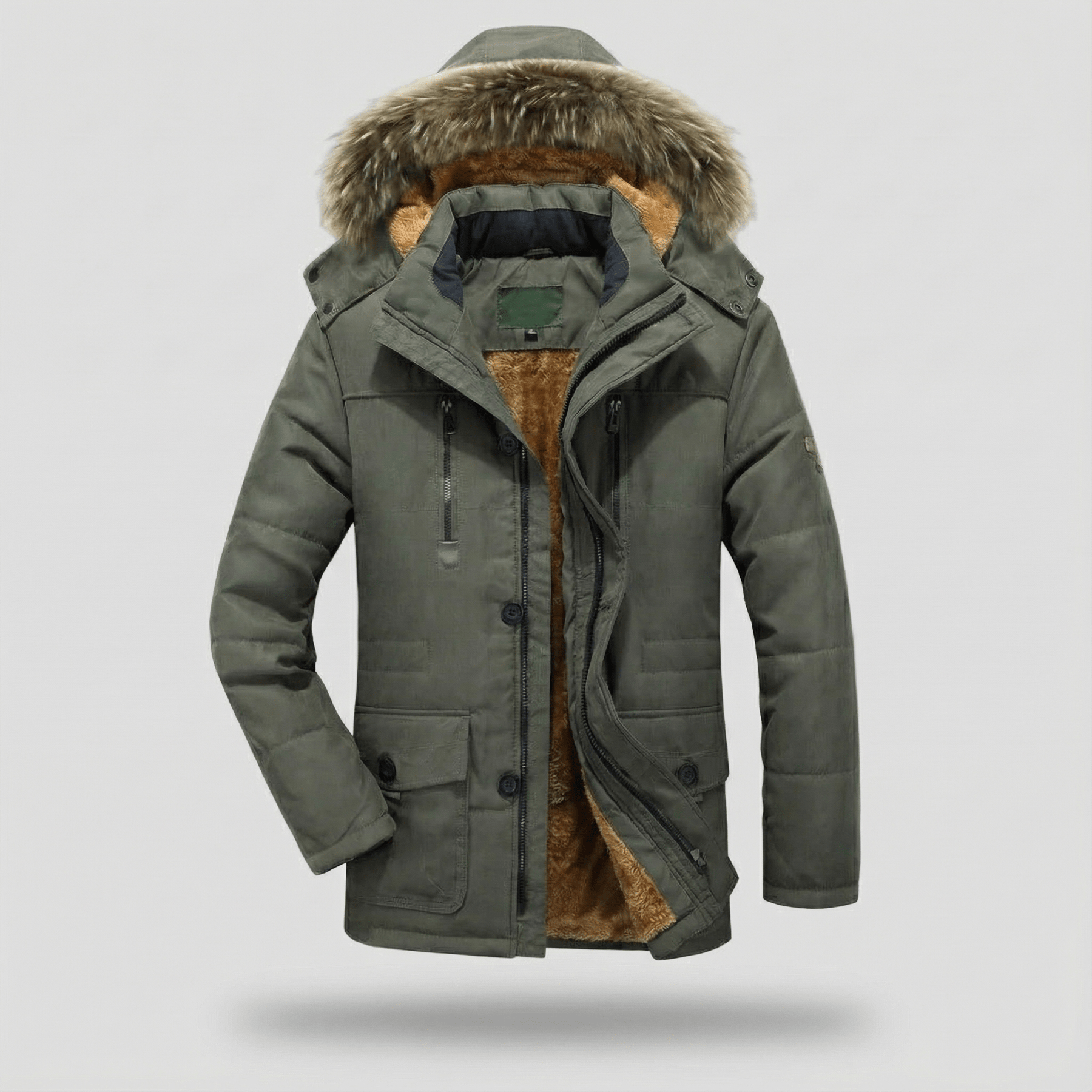 Engineered for the harshest winter days, this parka combines tactical utility with luxurious warmth. The outer shell is crafted from a durable, wind-resistant fabric in a classic olive green, designed to stand up to snow and sleet.